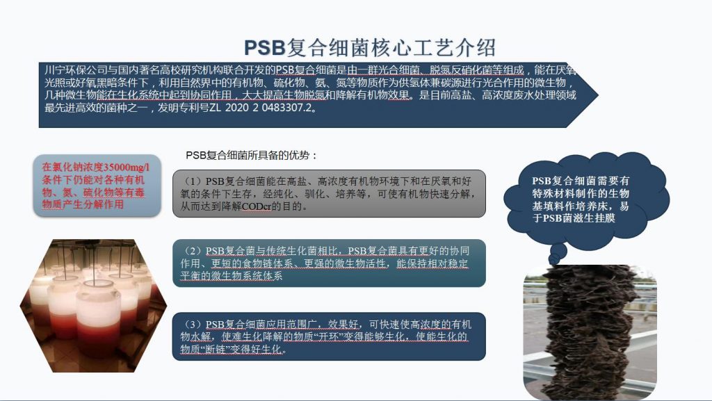 川寧環(huán)保公司與國內著名高校研究機構聯(lián)合開發(fā)的PSB復合細菌是由一群光合細菌、脫氮反硝化菌等組成,能在厭氧光照或好氧黑暗條件下,利用自然界中的有機物、硫化物、氨、氮等物質作為供氫體兼碳源進行光合作用的微生物,幾種微生物能在生化系統(tǒng)中起到協(xié)同作用,大大提高生物脫氮和降解有機物效果。是目前高鹽、高濃度廢水處理領域最先進高效的菌種之一,發(fā)明專利號ZL 2020 2 0483307.2。
